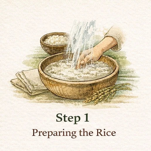 We begin by carefully washing rice until the water runs clear, then soaking it overnight so each grain is fully hydrated and ready for fermentation.