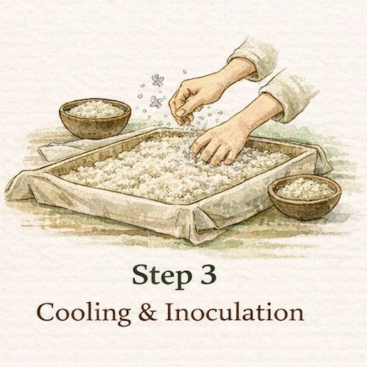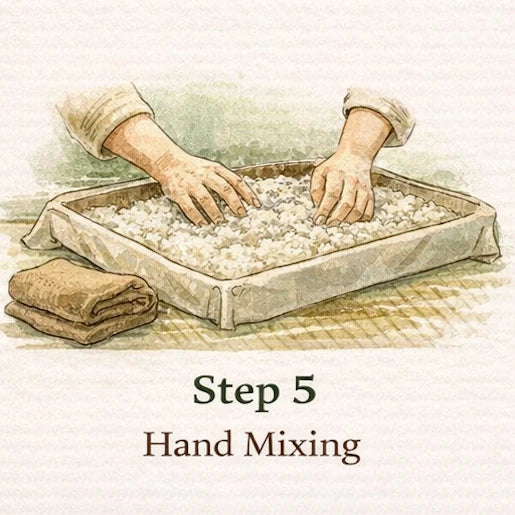 After steaming, the rice is spread out and gently cooled by hand. Once it reaches the right temperature, we sprinkle in koji spores and mix carefully so every grain has the chance to come alive.