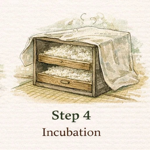 The inoculated rice is placed into trays, covered, and moved into a warm incubation space where the Koji mold begins to grow slowly and naturally.