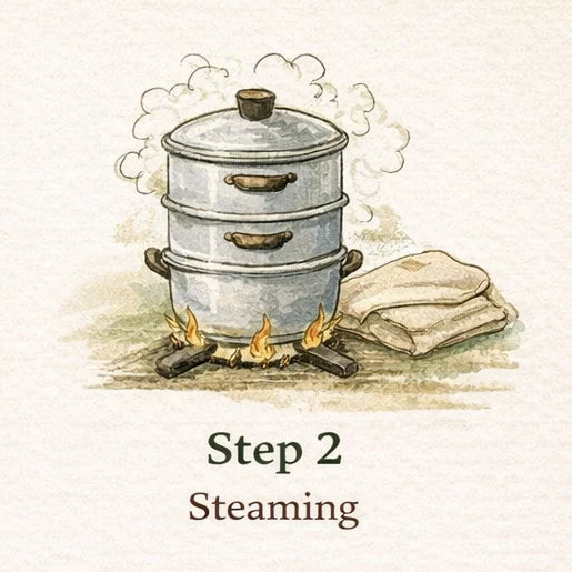 The next day, the soaked rice is gently steamed until perfectly tender. The kitchen fills with a warm, comforting aroma—this is where the process truly begins.